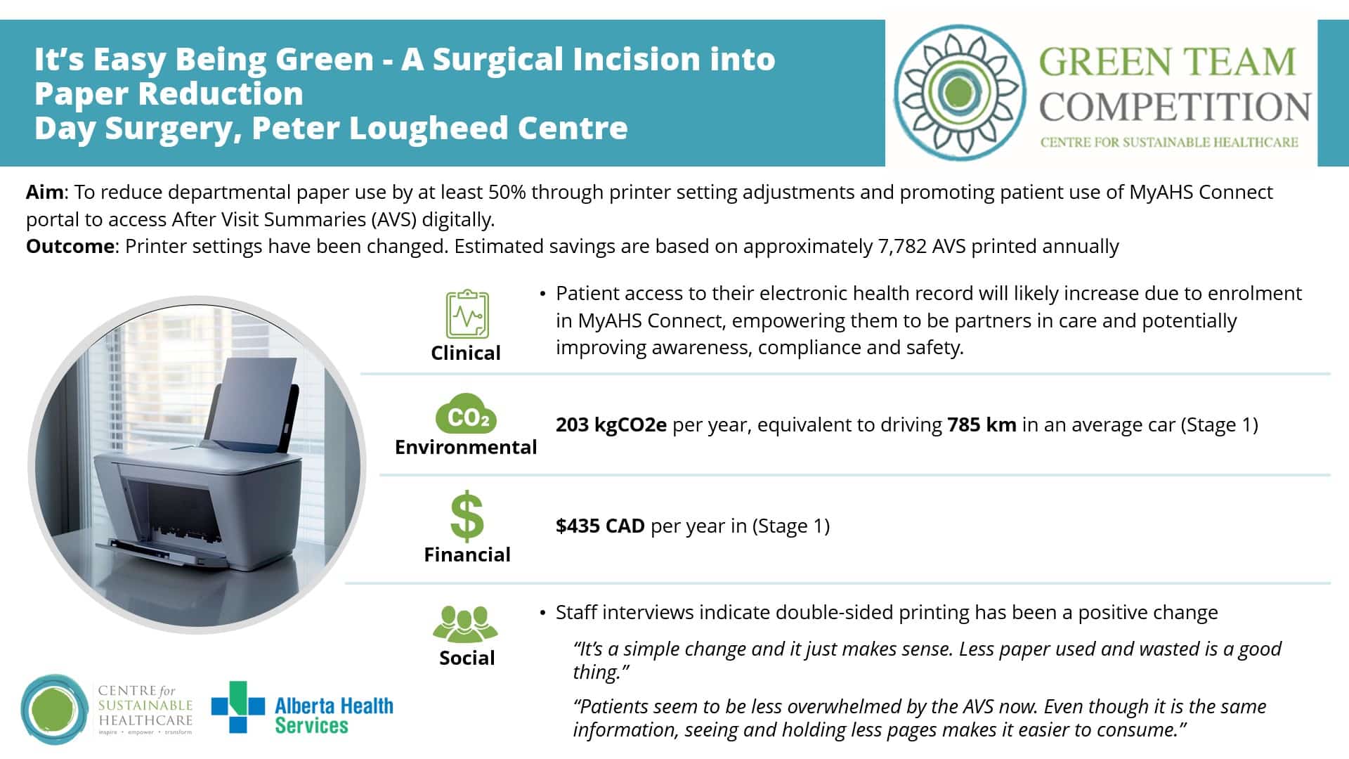 In early 2025, Alberta Health Services (AHS) commenced their Calgary Zone Green Team Competition in partnership with the Centre for Sustainable Healthcare, a clinical leadership and engagement programme for healthcare organisations wishing to improve the sustainability of their services.