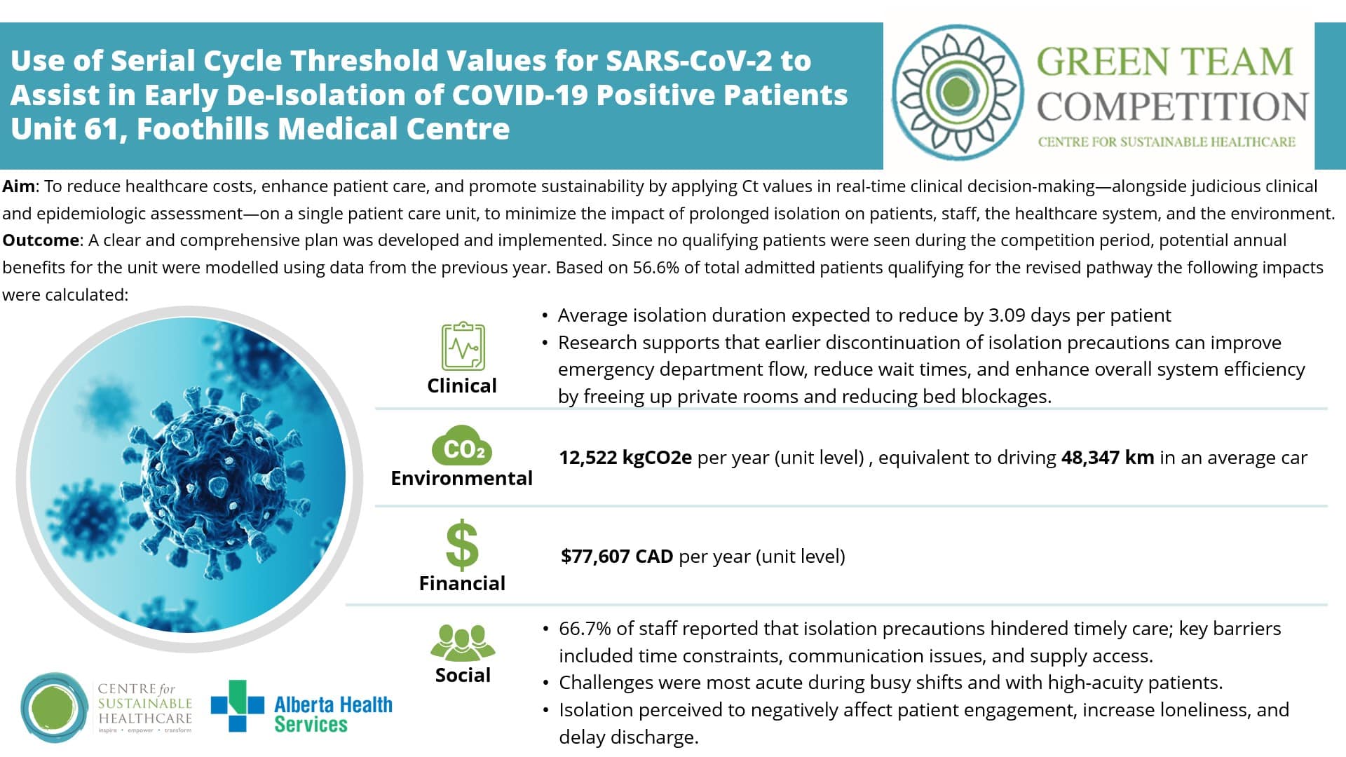 Modelling from the previous year suggested that 56.6% of admitted patients would qualify for early de-isolation, reducing isolation by an average of 3.09 days per patient. Projected annual savings include 12,522 kgCO₂e and $77,607 CAD, achieved through reduced PPE use and improved resource efficiency. Staff reported fewer care delays and improved workflow, while patients experienced enhanced care access and reduced distress associated with prolonged isolation. This initiative demonstrates how Ct-informed decision-making can improve care quality, reduce waste, and strengthen system sustainability across Alberta Health Services.