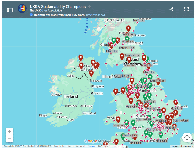 Concurrently, the launch of the national Kidney Centre Sustainability Champions scheme saw the recruitment and training of 60 champions across the UK. Champions complete the benchmarking survey and drive the adoption of sustainable best practice by leading their units to reduce carbon emissions, conserve resources, and share best practices across the UK, supported by the Sustainable Kidney Care Toolkit and a series of case studies.