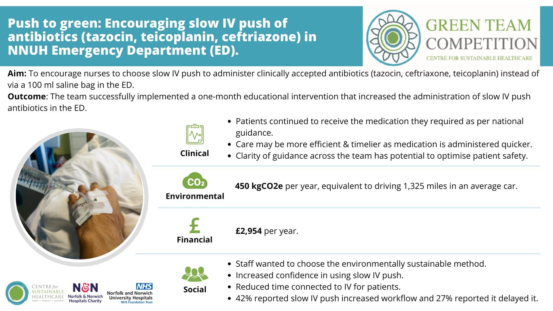 Following the intervention, slow IV push administration increased from 40% to 82% of eligible antibiotic doses, achieving annual savings of £2,954 and 450 kgCO₂e, equivalent to driving 1,325 miles in an average car. Patient safety and care quality were maintained while treatment became faster and more efficient, supporting timely sepsis management. Staff confidence improved, with 69% choosing the sustainable option and 48% reporting increased confidence in using slow IV push. The project demonstrates how targeted education and collaboration can improve workflow, reduce waste and deliver sustainable, high-quality patient care.