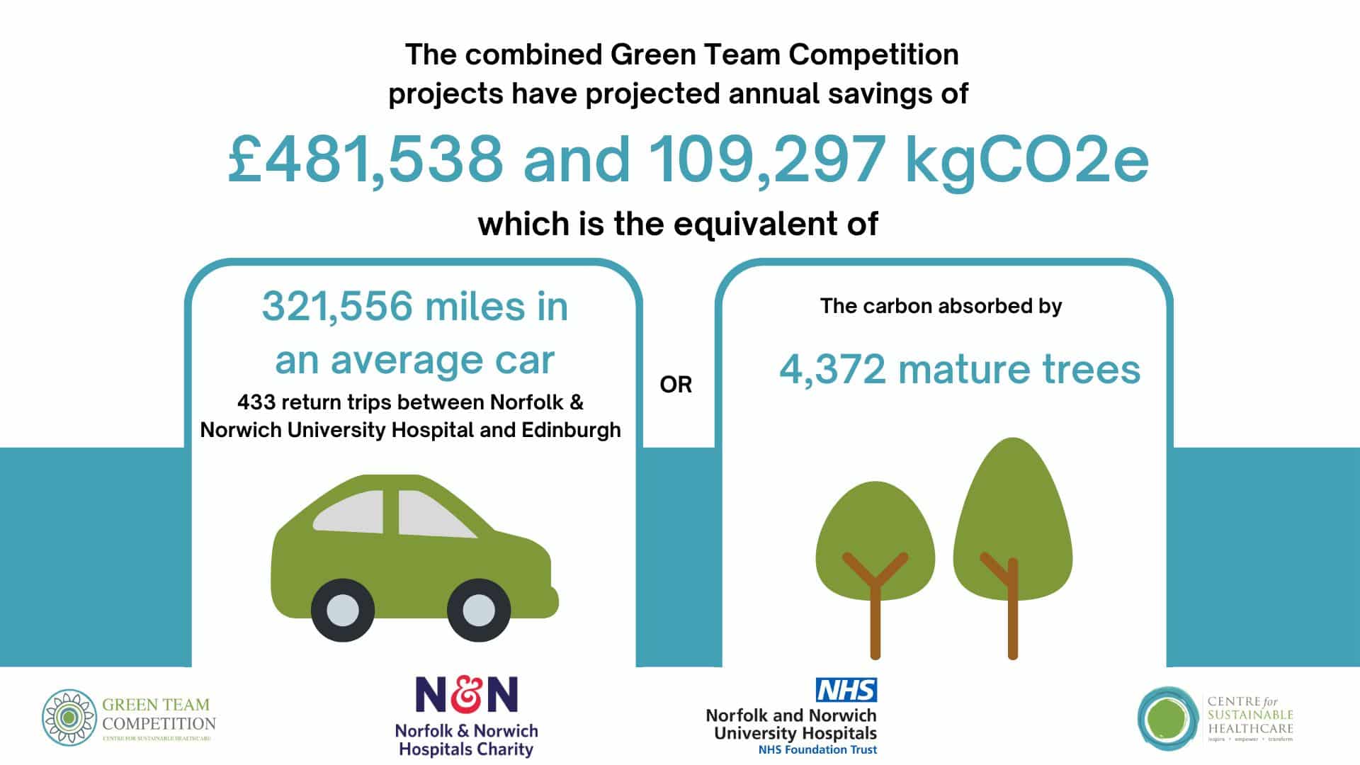 The Green Team Competition has brought meaningful, measurable value to NNUH. Collectively, the projects delivered through the competition are forecast to achieve £481,538 in annual cost savings and cut carbon emissions by approximately 109,297 kgCO₂e each year.