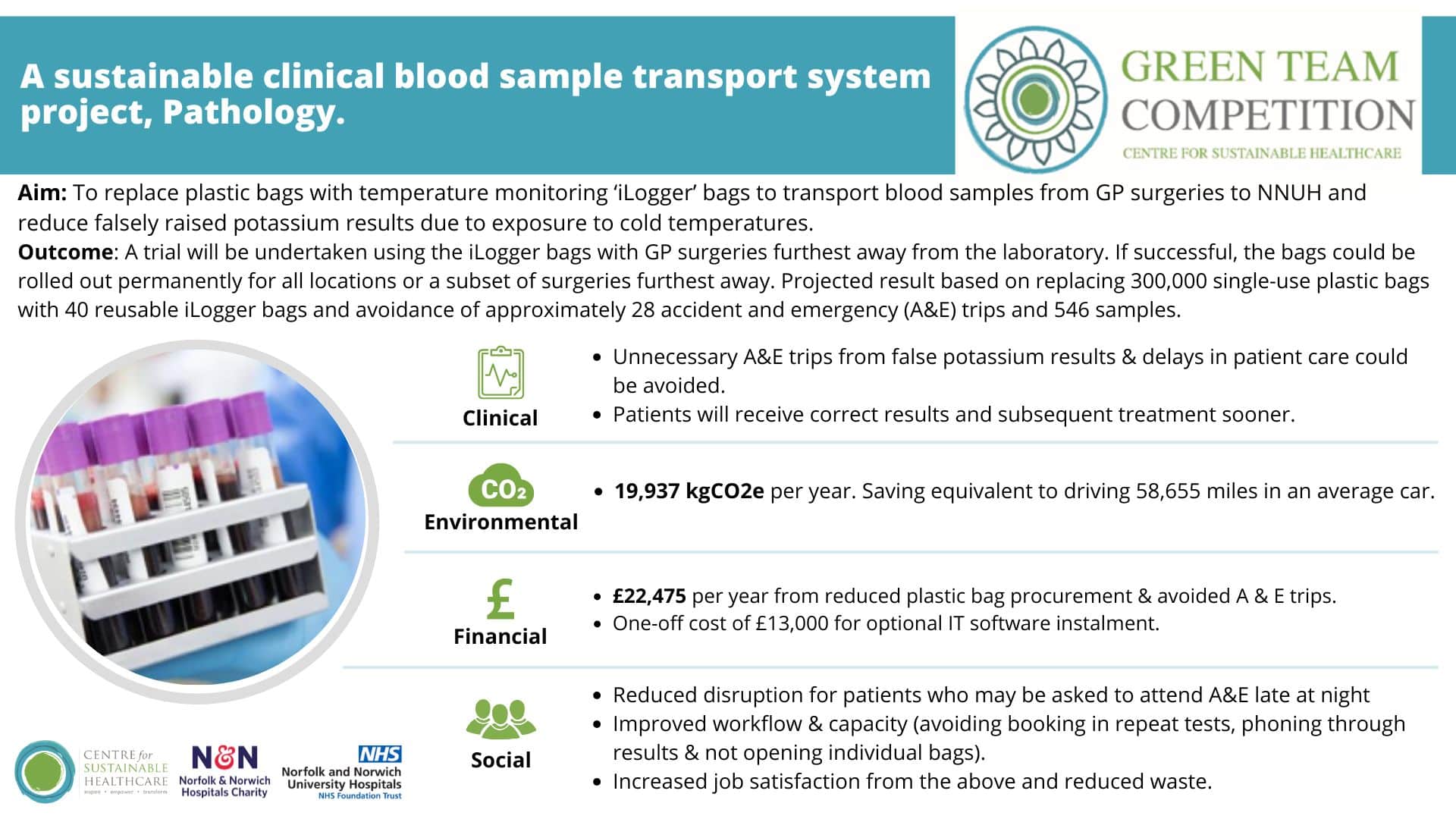 The team identified high numbers of falsely raised potassium results from GP surgeries in North Norfolk during winter months, caused by cold exposure during sample transport. This led to unnecessary hospital visits, repeat tests and increased waste due to single-use plastic packaging. To address this, the team trialled reusable insulated iLogger bagsequipped with temperature monitoring technology. These bags maintain optimal temperatures during transit and provide data integration with the laboratory IT system, ensuring accuracy and improving efficiency.