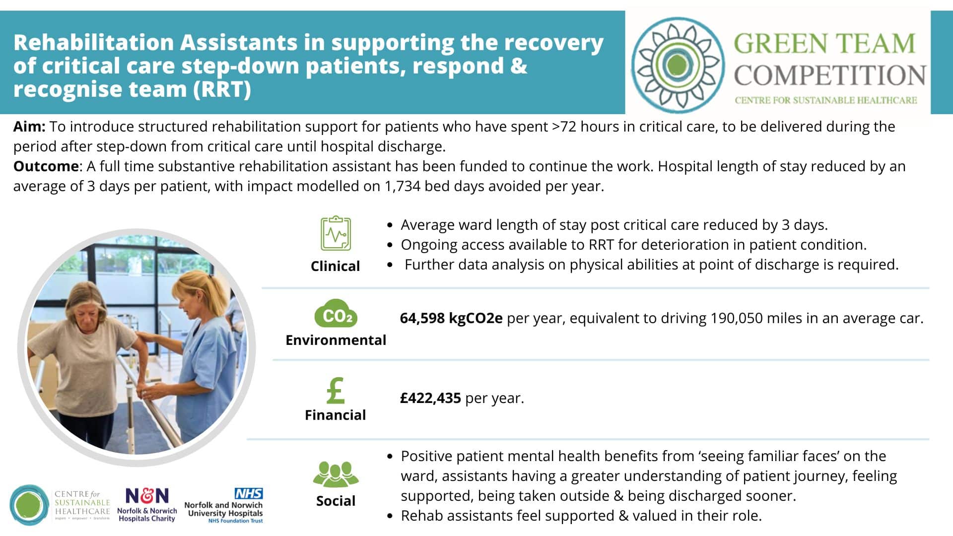 The project reduced the average hospital stay after critical care discharge by three days, saving approximately 1,734 bed days and £422,435 annually. Environmental savings total 64,598 kgCO₂e, equivalent to driving 190,050 miles in an average car. Patients reported improved wellbeing, reassurance and motivation through seeing familiar staff, while rehabilitation assistants felt valued and supported in their extended role. The initiative demonstrates how continued therapy after critical care can enhance recovery, reduce resource use, and improve both patient and staff experience.