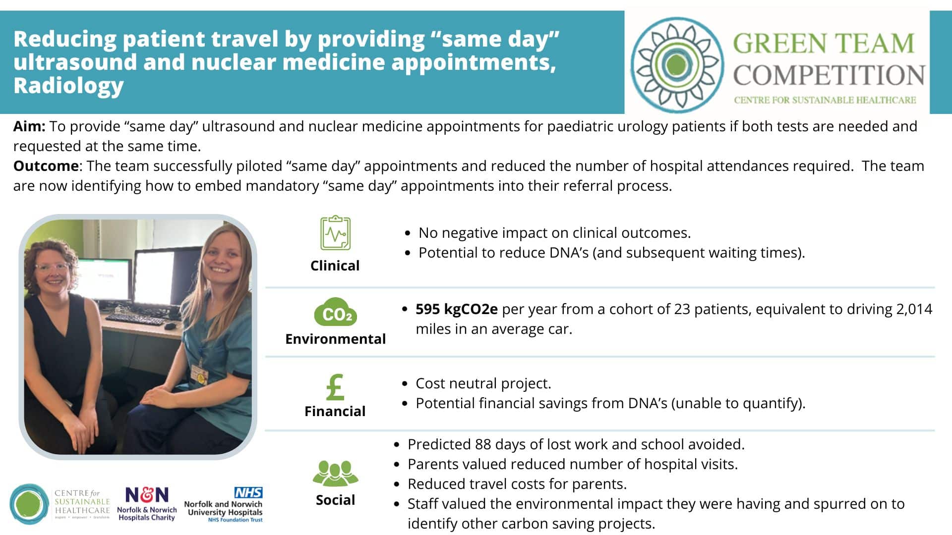Eight out of ten participating patients successfully received same-day scans, avoiding additional travel and saving an estimated 88.18 kgCO₂e, equivalent to driving 232 miles. Extrapolated across eligible patients, annual savings could reach 594.6 kgCO₂e and 2,013 miles avoided. Parents valued the convenience, with an estimated 88 school or workdays saved. The approach was cost-neutral, with potential efficiency gains from reduced DNA rates and streamlined bookings. Staff engagement increased, inspiring further sustainability-focused improvements in radiology scheduling.